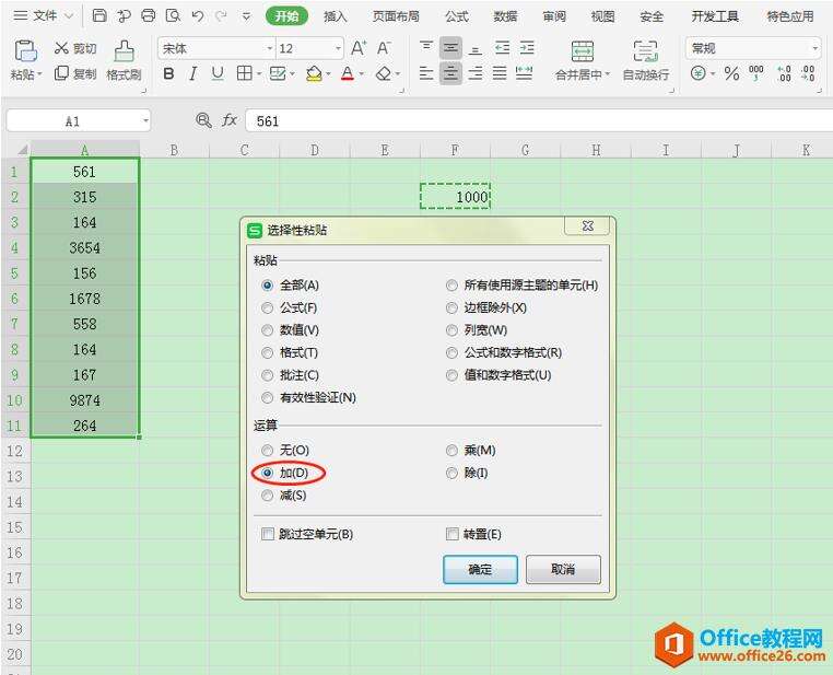 “运算”下的“加”前的圆圈点中,后直接按“确定”,回到单元格中,可以看到A1:A11单元格的所有数值都加上了“1000”,显示结果如下: