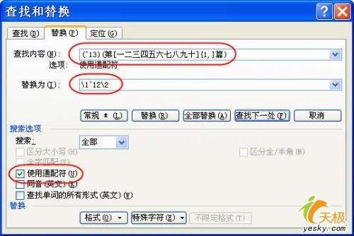 在“查找内容”框中输入“(^13)(第[一二三四五六七八九十]{1,}篇)”,其中“()”用于分组,此处查找内容被分为两组;与^p一样,“^13”也代表段落标记,但在图2中“使用通配符”复选项被选中时,^p在“查找内容”框中不能使用,只能用“^13”。当首篇文章位于文档开头时,在此添加一个“^13”便可避免在首篇文章前添加分栏符(如果第一篇文章前还有前言,则另当别论);“[一二三四五六七八九十]”表示方括号中的任一字符;“{1,}”表示至少出现1个前一字符,此例中也可以使用“{1,5}”。