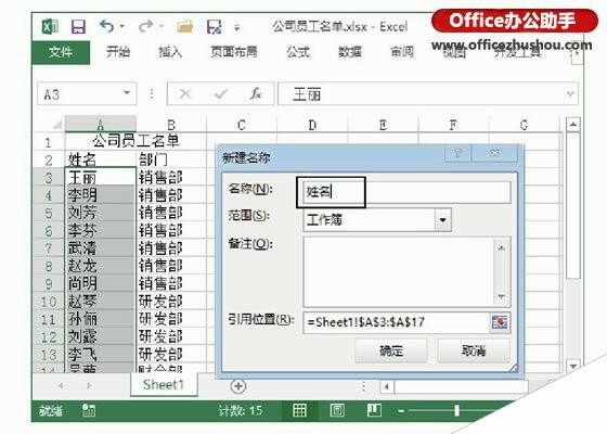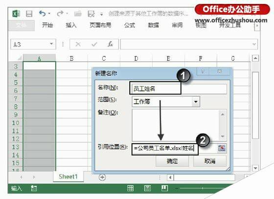 2、在需要创建数据验证下拉列表的工作簿中选择单元格区域,打开“新建名称”对话框,在对话框的“名称”文本框中输入单元格区域名称,在“引用位置”文本框中输入源数据的引用位置,如这里输入“=公司员工名单.xlsx!姓名”,如图2所示。完成设置后单击“确定”按钮关闭对话框。
