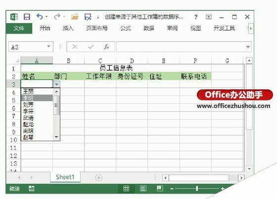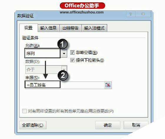 3、在“数据”选项卡的“数据工具”组中单击“数据验证”按钮打开“数据验证”对话框,在“设置”选项卡的“允许”下拉列表中选择“序列”选项,在“来源”文本框中输入上一步定义的单元格区域名称,如这里输入“=员工姓名”,完成设置后单击“确定”按钮关闭对话框,如图3所示。