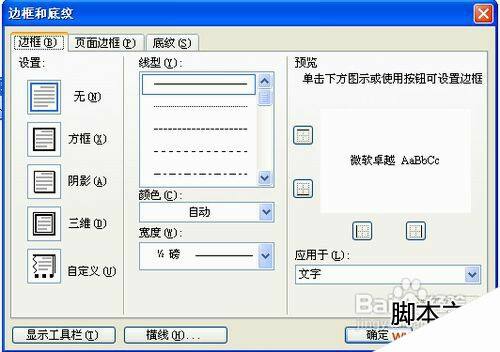 选择边框和底纹选项,然后打开边框和底纹窗口,切换到边框选项卡,如图所示: