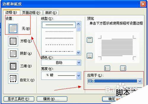 然后在设置一栏下方选择“无”,然后将右下角“应用于”下拉框中改为“段落”,点击确定即可,如图所示: