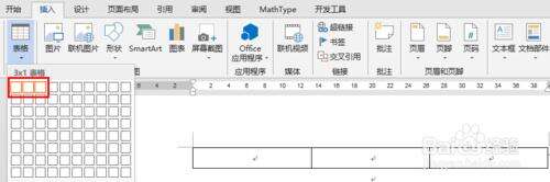 在公式所在行居中插入一行三列的表格,具体操作为: