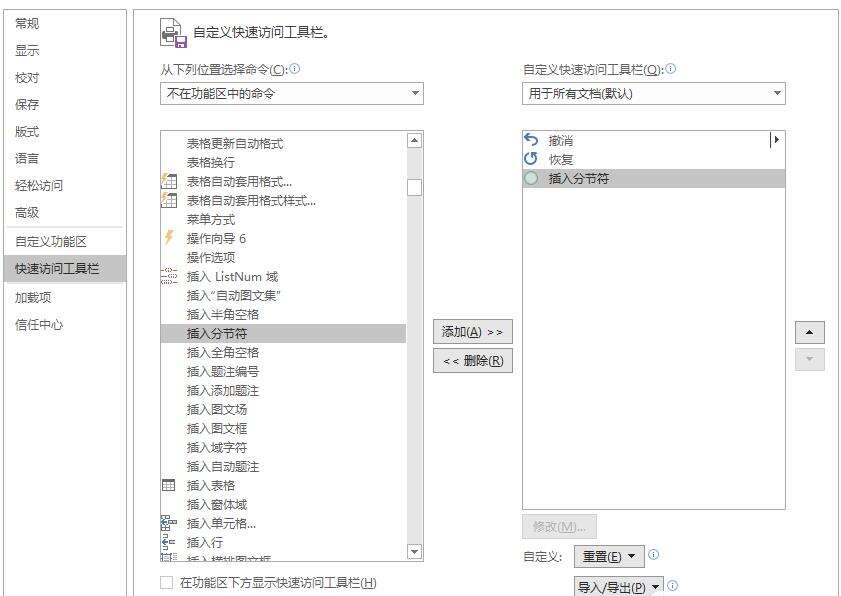 选择不在功能区的命令,找到插入分节符,点击添加,然后在快速访问栏就有插入分节符的命令了。需要分节时,点击一下即可。