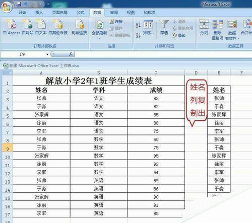 2、将姓名列复制出来,粘贴到后方位置,这里为了方便演示放在同一个表格中,也可以根据需要粘贴到新的表格中;