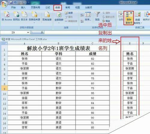 3、选中粘贴出来的姓名列,点击上方“数据”,选择“删除重复项”,一定要选中列否则无法进行操作;