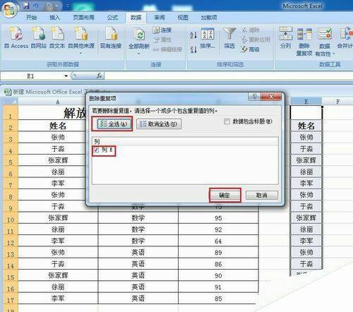 4、弹出窗口中,“列”前方打钩,确定,观察去除重复值是否正确,一般不会有错,确定完成;