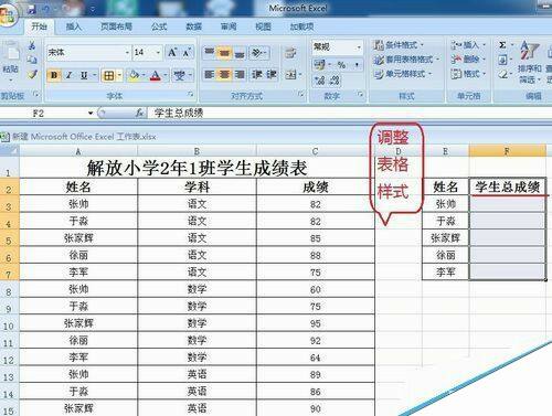 5、姓名无重复值,调整表格样式,根据个人喜好即可,后方输入“学生总成绩”;