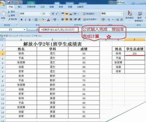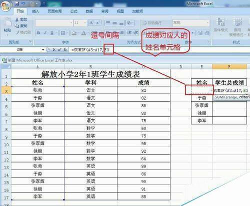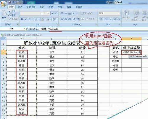 6、总成绩列下方第一个单元格输入“=sumif”,第一个定位是前方姓名条列,拖动选中即可,会有虚线边框提示;
