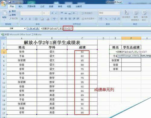 公式中三个定位一定要准确,就是如果有某某在成绩中合并计算某某成绩