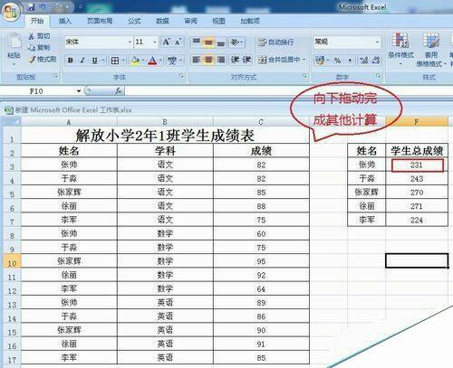 9、张帅个人总成绩计算完成,拖动成绩单元格向下,完成其他学生成绩填充,为防止错误可以自行求和计算比对是否有错误。
