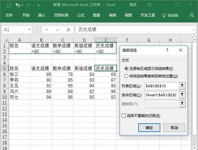 4、如果要筛选出多个分类的成绩如四门成绩大于80分的同学,我们需要预先建立条件区域,将数据整体上方空出三行或以上,分别对应输入数据分类和需要的条件限制