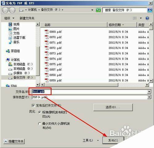 3、弹出了另存诶对话框,选择好文件存放的位置,然后设置文件名,记得文件名的后缀是pdf,然后点击发布即可。