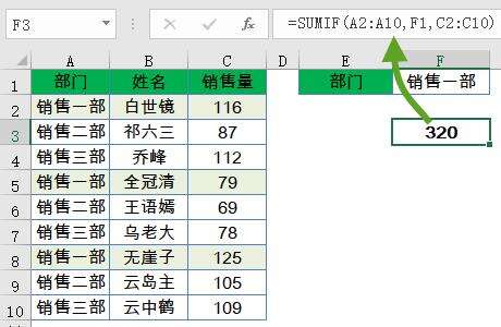 如果A列中的部门等于F1单元格指定的条件,就将对应的C2:C10单元格中的数值求和。