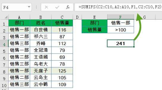 如果A列部门等于F1指定的部门,并且C列销售量符合F2指定的条件大于100,就对C2:C10的数据进行求和。