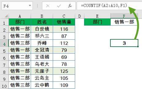 统计A2:A10中的部门,有多少个等于F1单元格指定的部门销售一部,统计条件也可以使用通配符。