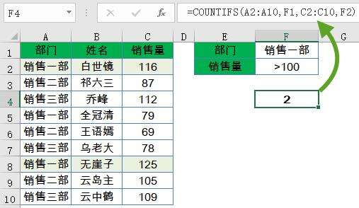 统计“A2:A10中的部门等于F1单元格指定的部门,并且C2:C10单元格区域中的销售量大于100”的个数,统计条件支持通配符。