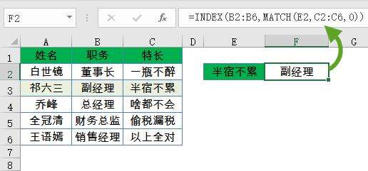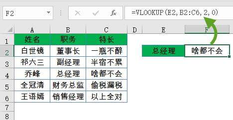 如下图,需要根据E2中的职务“总经理”,查询对应的特长,公式为: