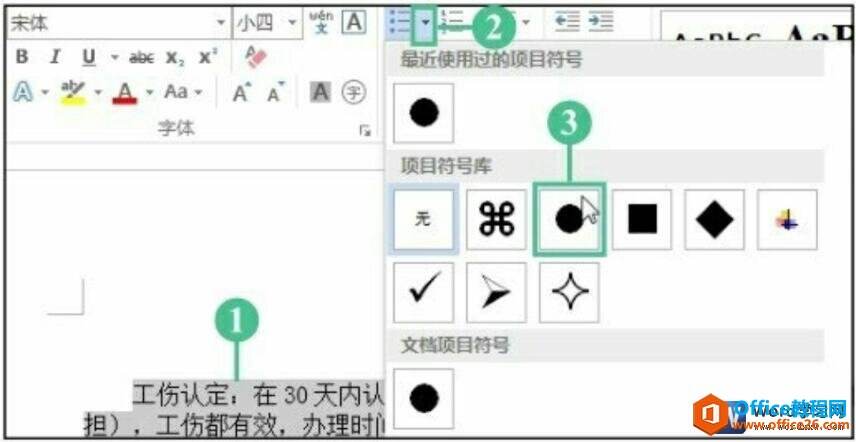 此时在段落的首行添加了设置的项目符号,选择下一处需要添加项目符号的内容,然后继续单击“段落”组中的“项目符号”右侧的下三角按钮,在展开的下拉列表中单击需要的项目符号,如下图2所示。