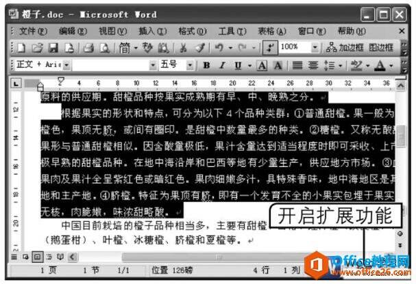 单击文本起始处,按【F8】键或双击状态栏中的“扩展”按钮扩展(使其变为黑色显示),再在要选择文本的结尾处单击鼠标,即可选中该区域之间的所有文本,如图2所示。不使用扩展功能时,再次按【F8】键或双击状态栏上的扩展按钮即可关闭扩展功能。