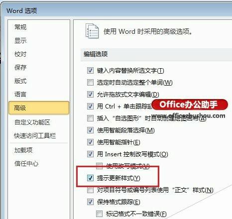 第2步,打开“Word选项”对话框,切换到“高级”选项卡。在“编辑选项”区域选中或取消“提示更新样式”复选框,并单击“确定”按钮,如图3所示。