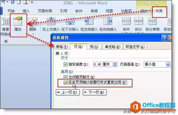 如果想让每一页都显示标题行。选取一行或多行,表格工具 – 布局 – 属性 – 选取“在每页顶端…"