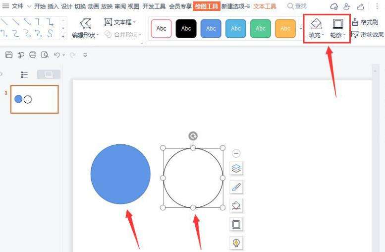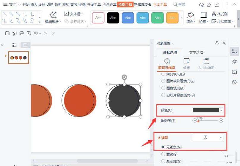 4.接着,鼠标选中两个组合圆形,进行复制粘贴,为圆形更换不同颜色,并将线条设置为无线条效果