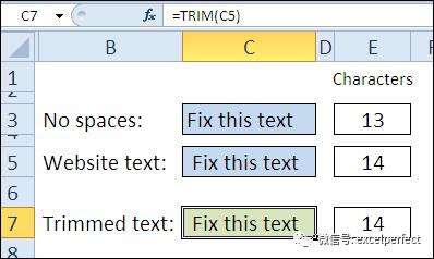 可以使用TRIM函数删除文本字符串开头和结尾的所有空格字符。在下面的截图中,在单元格C5的文本开头和结尾各有2个多余的字符。单元格C7中的TRIM函数删除这4个空格。