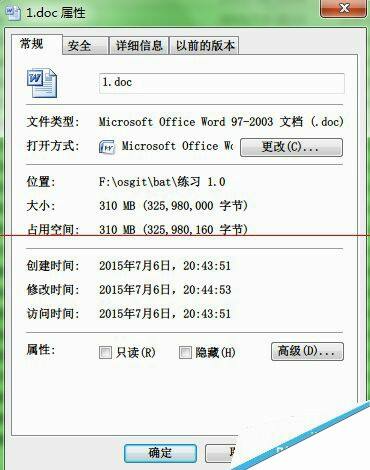 4、等待一会儿,会在当前目录生成一个1.doc,在批处理运行过程中,1.doc大小是不断增加的。上面代码中,懒蛇运行了3000次,也就是300*107K,最后生成了310M大小的1.doc文件。