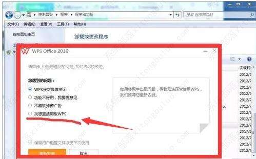 4、它会弹出一个窗口,相当于【用户反馈】,可以选择最后一项【我想直接卸载wps】即可开始卸载了。如果选择其他选项它不会卸载而是修复。