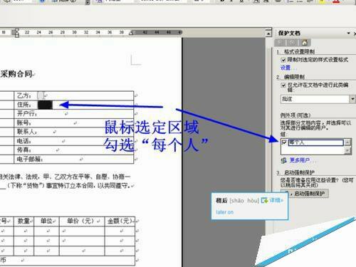 5、选定不需要保护的内容,然后勾选右侧的“每个人”,一般情况下是空白部分。如图所示