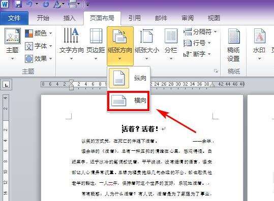 3、点击界面上方的”布局“,点击下一行中的”纸张方向“,点击下拉箭头,选择”横向“。