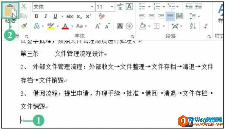 将插入点定位在文本需要移动到的位置,然后在“开始”选项卡下的“剪贴板”组中单击“粘贴”按钮,如下图2所示。