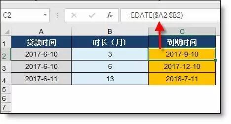 EDate(开始时间,间隔月数):N月后的日期。如间隔月数为负则表示N月前的日期。