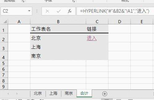=HYPERLINK(“#”&B2&”!A1″,”进入”)