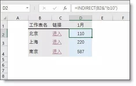 Indirect函数:它的作用是把单元格地址串转换为引用。如本例中 B2&”!b10″ 连接起来虽然是工作表名!单元格,但它只是个字符串而已,并不会把单元格中的值取出来。利用Indirect转换后则可以取单元格中的值了。