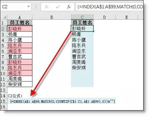 COUNTIF(C$1:C1,A$1:A$99):让C列本公式上面的姓名在A列逐个用Countif函数统计个数,如果不存在(正是要提取的唯一值)结果为0,然后用Match(0,统计的个数,0)查找0所在的行数。