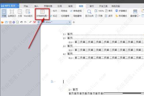 2、接着点击页面上方工具栏中的“视图”选项卡,选择菜单栏中的“文档结构图”选项。
