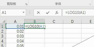 5、在B1单元格输入“=LOG10(A1)”,即求出以10为底的对数函数值