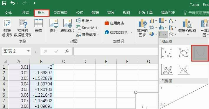 7、选中A、B两列,依次点击“插入”、“散点图”、“带平滑线的散点图”
