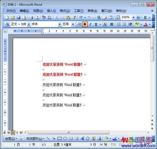 第一步、选中第一排中的“欢迎大家来到Word联盟!”,然后鼠标单击常用工具栏上的“格式刷”按钮;