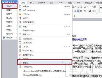第二步点击“wps文字”下方的小箭头,选择“文件->属性”,如下图所示: