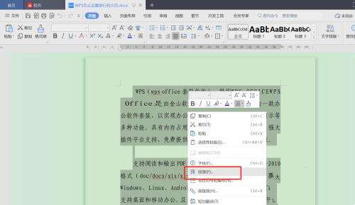 选中文本内容,单击鼠标右键,并点击右键菜单“段落”选。
