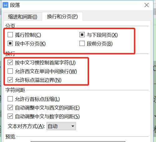 在“换行”和“分页”栏勾选或取消勾选相应功能即可。