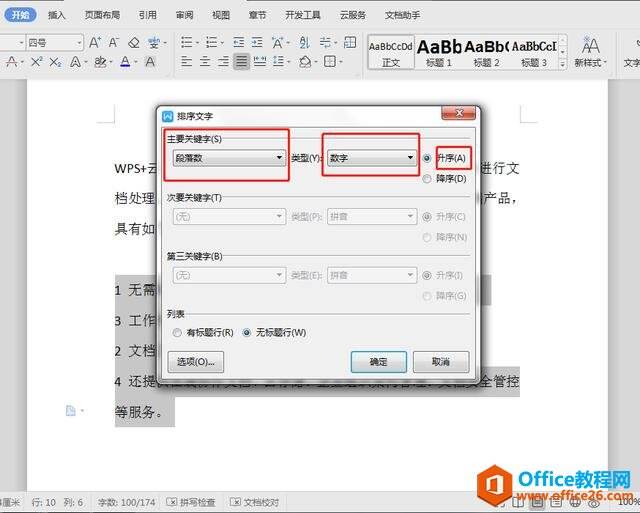在“排序文字”设置中,关键字选择“段落数”,类型选择“拼音”,排序方式为“升序”。