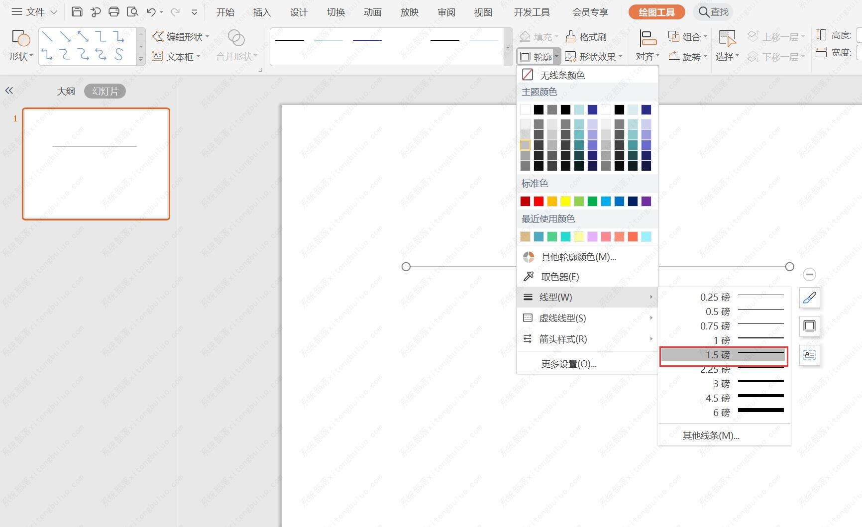 2、选中直线,颜色填充为灰色,线条宽度设置为1.5磅。