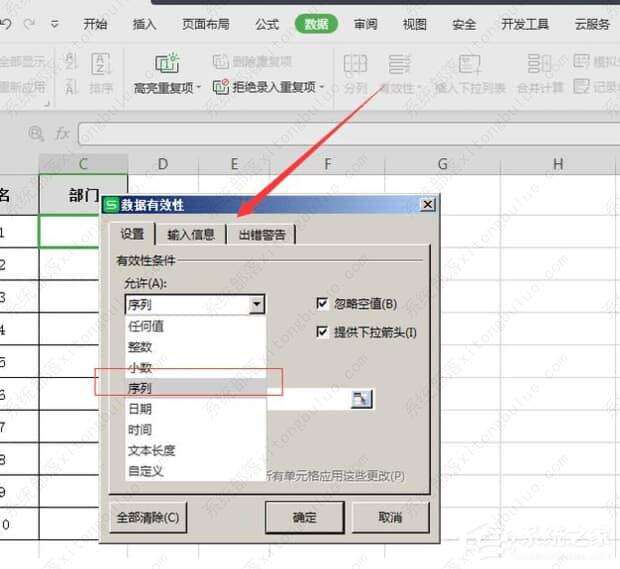 5、弹出“数据有效性窗口”,点击“设置”下的“有效性条件”中单击“序列”选项。