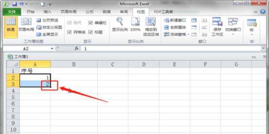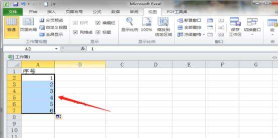 2、在A2单元格输入数字1,然后选中A2单元格,鼠标拉住A2单元格右下角,向下拖拉;