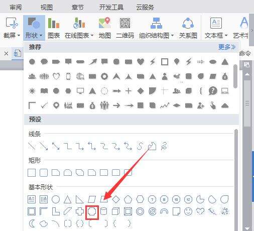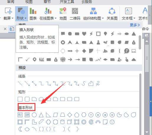 4、点击形状选项,在其子级菜单里找到基本形状选项,如图所示: