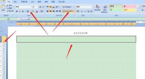 3、按住鼠标左键框选第一行,在左侧调整行高,然后点击工具栏,选择合并单元格,然后点击添加所有框线。